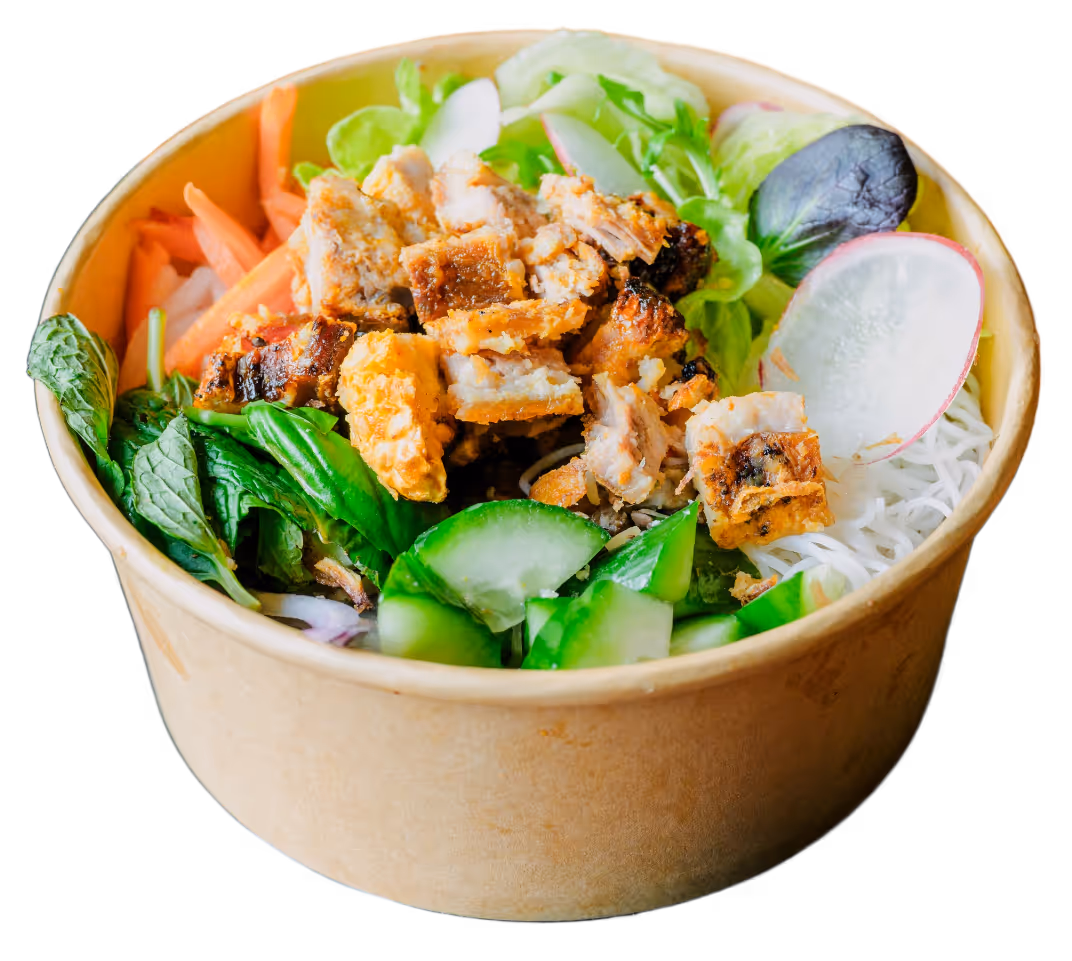 Steamed Jasmine Rice with fresh lettuce, pickled carrots, fresh mint, cucumber, crispy shallots with our homemade dressing.